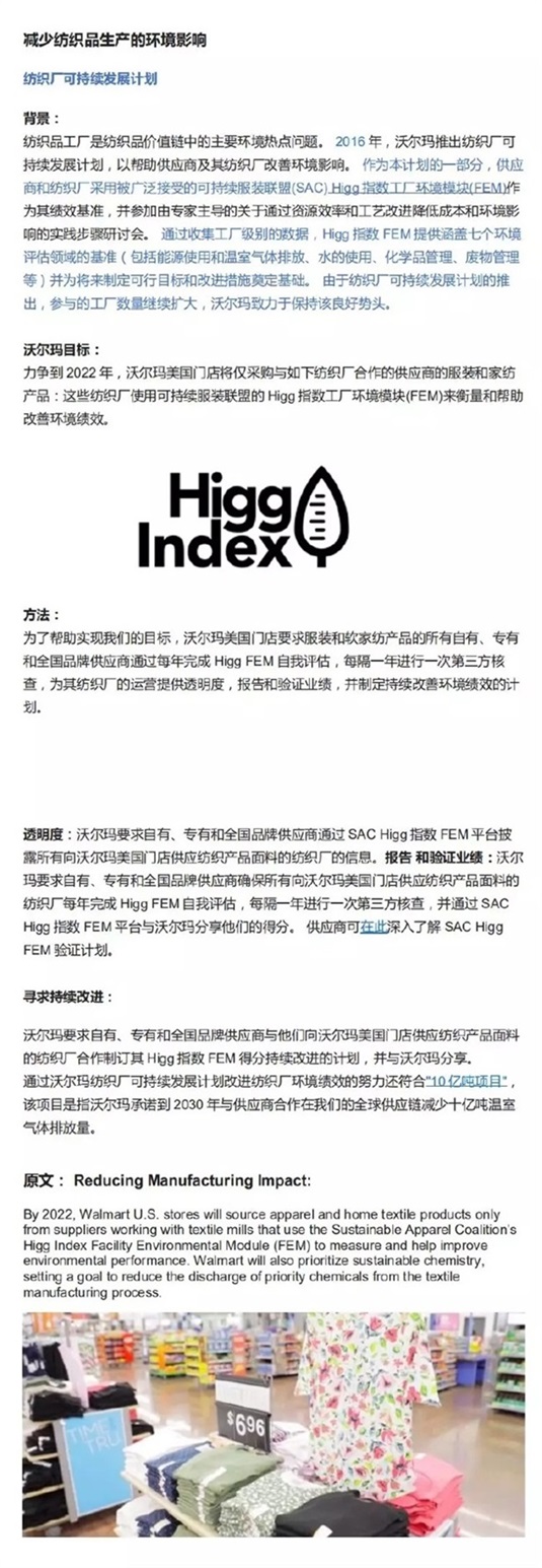 · 沃爾瑪要求其供應(yīng)美國沃爾瑪門店的自有/專有/全國品牌的服裝供應(yīng)商/軟家紡產(chǎn)品供應(yīng)商/供應(yīng)紡織產(chǎn)品面料的紡織廠在2022年之前, 每年完成一次Higg FEM的自評;